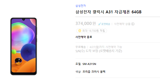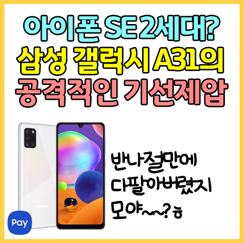 갤럭시 A31은 삼성전자가 2020년에 처음으로 선보이는 중저가 스마트폰인데, 4월 27일 삼성전자 공식 홈페이지를 비롯해 11번가, 쿠팡 등에서 사전예약 판매가 시작되었고 , 놀라운 가성비로 사전예약 하루만에 준비된 물량이 모두 품절이 되어버리고 말았다.