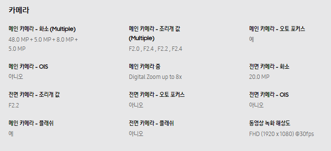 물론 후면 카메라의 갯수가 같다고 갤럭시 S20 5G와 같은 카메라 성능을 기대할순 없겠지만, 그래도 저가라인 스마트폰에 4개의 쿼드카메라를 탑재했다는건 칭찬 해줄만한 부분이다.