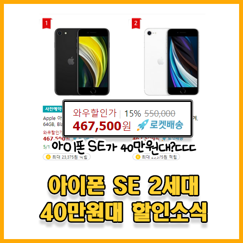 쿠팡에서 공식적으로 진행하는 아이폰SE2 자급제 스마트폰을 사전예약하면 공홈 판매가 보다 훨씬 저렴한 46만원대에 아이폰 SE 2세대를 구매할 수 있다.