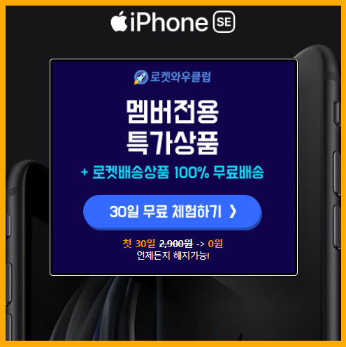 만약, 로켓와우 멤버십을 예전에 가입했다가 해지했던 경우라도 다시 무료체험이 되는경우도 있으니 시도해보면 된다. 안될경우 가족명의의 쿠팡아이디로 아이폰 SE를 구매하거나, 어쩔수없이 아이폰 SE2의 할인을 받기위해 2,900원을 투자하거나 해야한다.