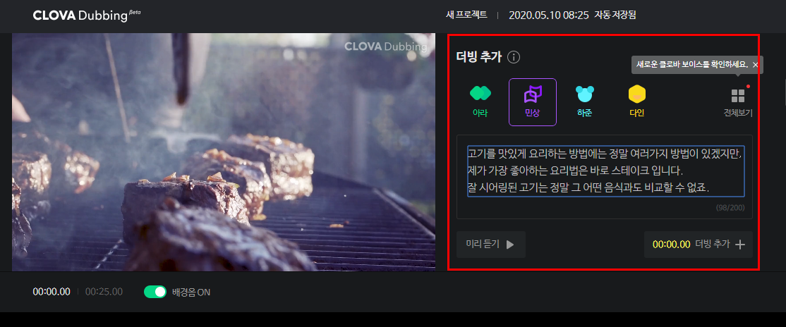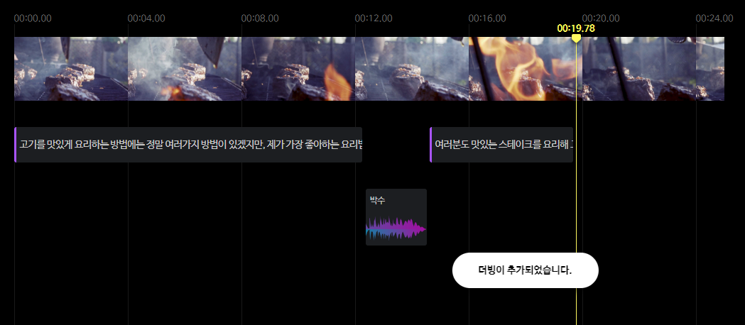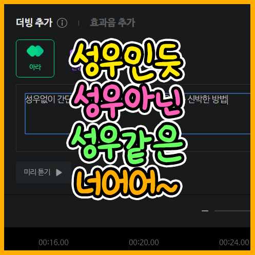 띄어쓰기나 맞춤법, 마침표 등을 깔끔하게 입력하면 좀 더 자연스러운 목소리가 더빙되며, 빨간박스 오른쪽 하단의 더빙 추가 버튼을 누르면 아래 타임바에 바로 더빙된 목소리가 실시간으로 추가된다.