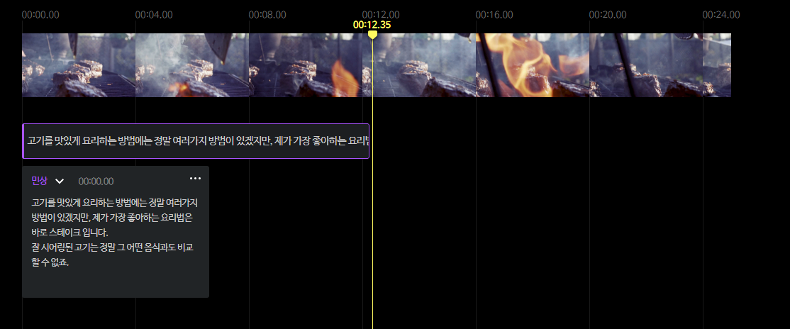 사용자가 어떠한 더빙인지 인지하기 쉽게 사운드 클립 자체가 텍스트로 표현되며, 클립을 누르면 전체 내용의 텍스트를 확인할 수 있는 보조창이 붙는다.