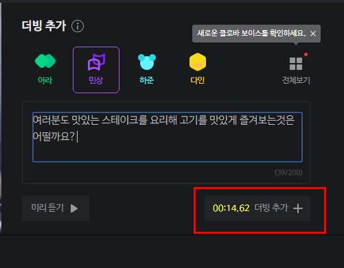 더빙 추가 구획에서, 원하는 목소리를 선택 후 더빙하고픈 내용을 입력해주면 실시간으로 더빙이 진행된다.