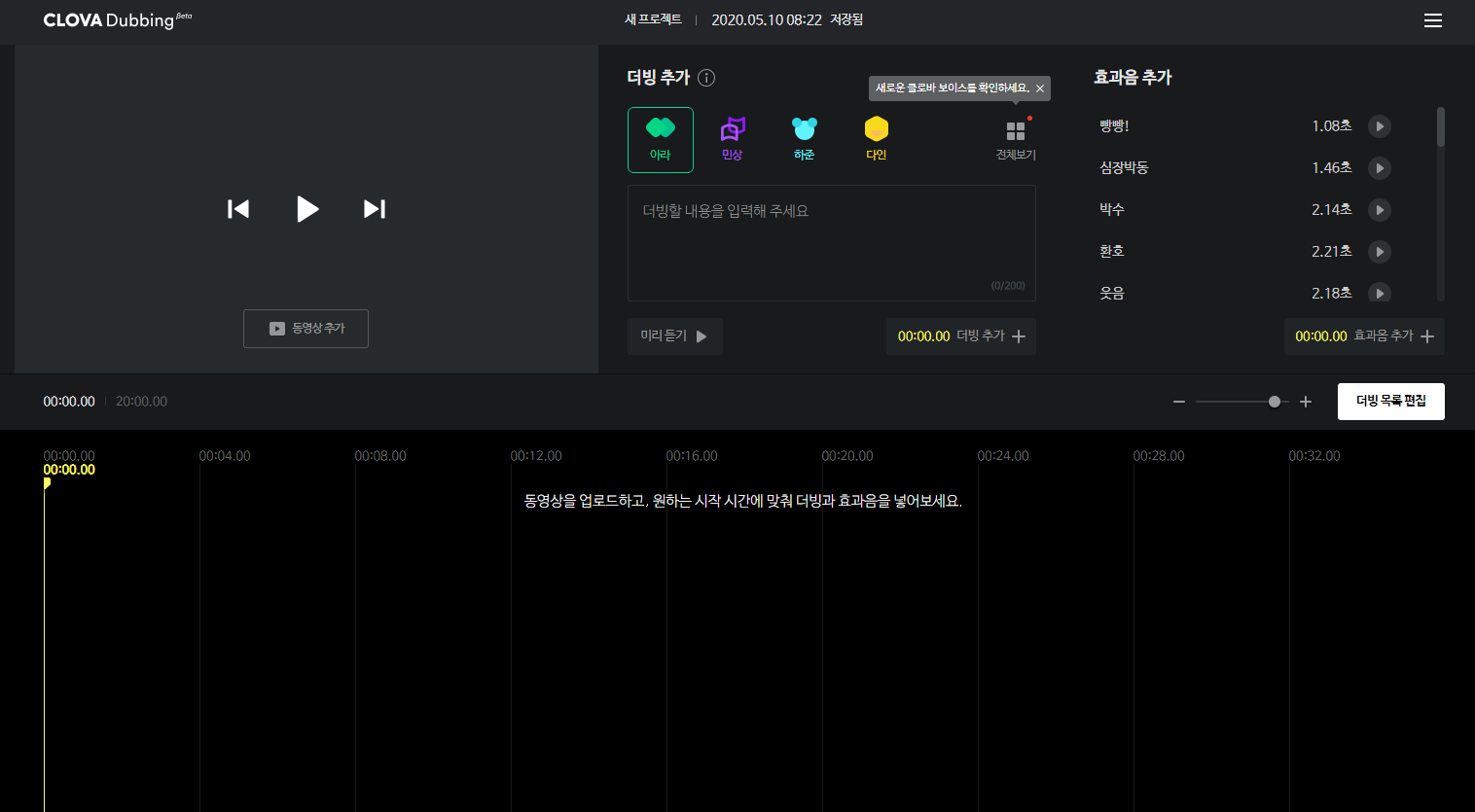 깔끔한 블랙 테마로 구성된 네이버 클로버 더빙의 메인화면이다.