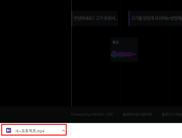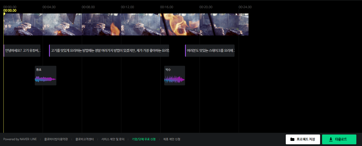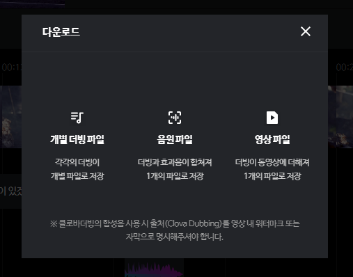 더빙이 끝난 후 클립들을 드래그하면 위치가 쉽게 이동되어 최종적으로 사운드 클립들의 위치를 잘 배치해주고 난 후 오른쪽 다운로드 버튼을 눌러 영상, 혹은 음성파일을 다운받으면 더빙작업이 끝이난다.
