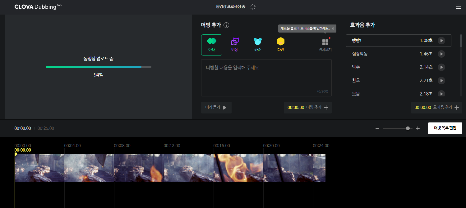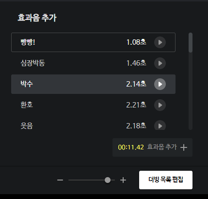 네이버 크로바 더빙화면의 우측 상단에는 효과음도 추가할 수 있는데, 간단하게 클릭해 미리듣고 원하는 구획에 효과음을 추가할 수 있다.
