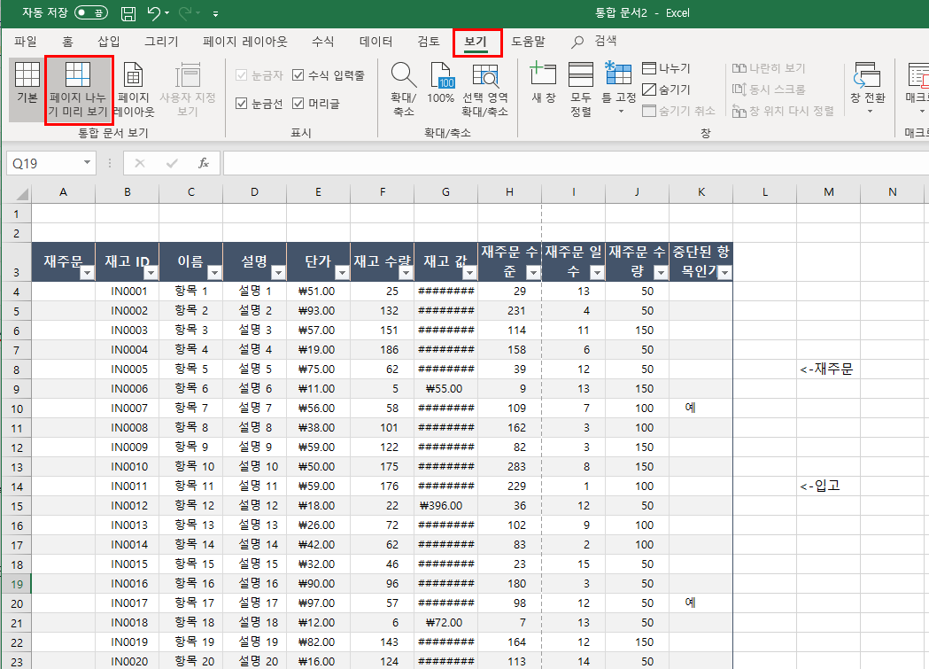 상단 메뉴의 "보기"탭을 클릭 후 "페이지 나누기 미리 보기" 메뉴를 확인하실 수 있습니다.