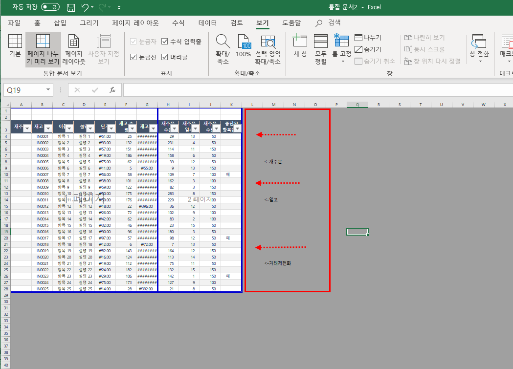 우리는 비록 엑셀로 함수를 능수능란하게 짜거나 엑셀로 프로그램을 만들거나 하는 등의 고급 작업은 할 수 없지만, "excel 배우기 초급반"만큼은 등록하고 싶지 않으므로, 1, 2페이지로 나누어진 영역들도 조정해줍니다.