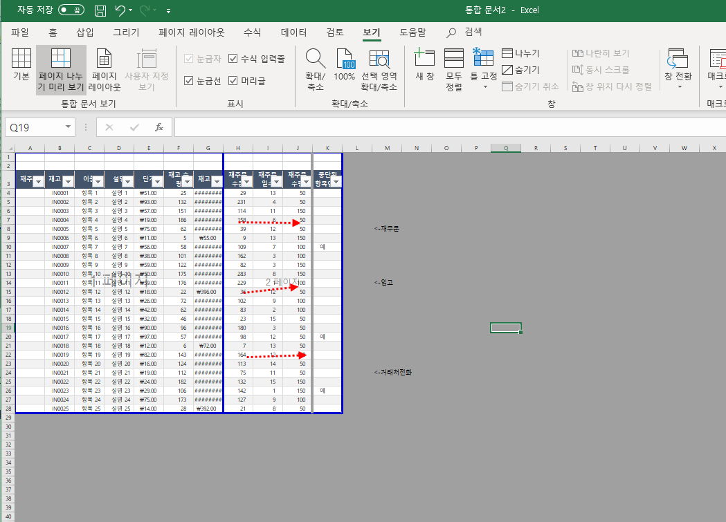 날밤을 새며 만든 excel 표가 캡춰화면을 보시는바와 같이 1페이지, 2페이지로 나누어져 있습니다.