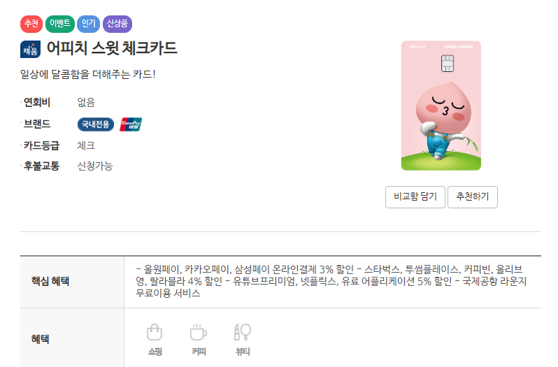 어피치 스윗 체크카드는, 쇼핑, 커피, 뷰티에 혜택이 집중되어 있으며, 스타벅스, 투썸플레이스, 커피빈, 올리브영, 랄라블라에서 무려 4%의 할인을 받을 수 있다는 장점이 있습니다.