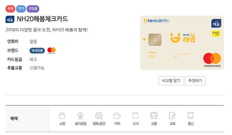 위의 네가지의 농협 체크카드 중 눈에 띄는것은 20대를 위한 NH20해봄 체크카드와, 올바른 POINT 체크카드가 최근에 출시된 체크카드임에도 인기순위 상위에 랭크되었다는 점입니다.