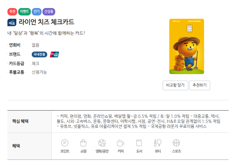 라이언 치즈 체크카드의 핵심 혜택으로는, 포인트 적립이 가능한 영역이 많다는것 입니다.