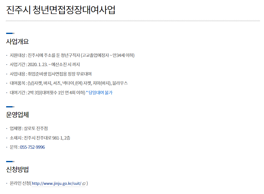 특히, 진주시청의 청년면접정장대여사업이 눈에 띄는데, 갓 대학을 졸업한 청년이거나, 급하게 구인구직 정보를 접하고 면접일정을 잡게된 청년층들에게 정장을 무료로 대여해줌으로써 자금사정이 넉넉치 않은 청년들에게 상당히 유용한 서비스가 될 수 있는 사업으로 보여집니다.