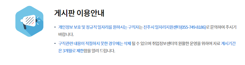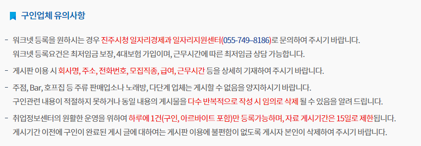 먼저 구인업체가 진주시청 구인구직 사이트를 통해 구인글을 등록할 경우의 주의사항 입니다.