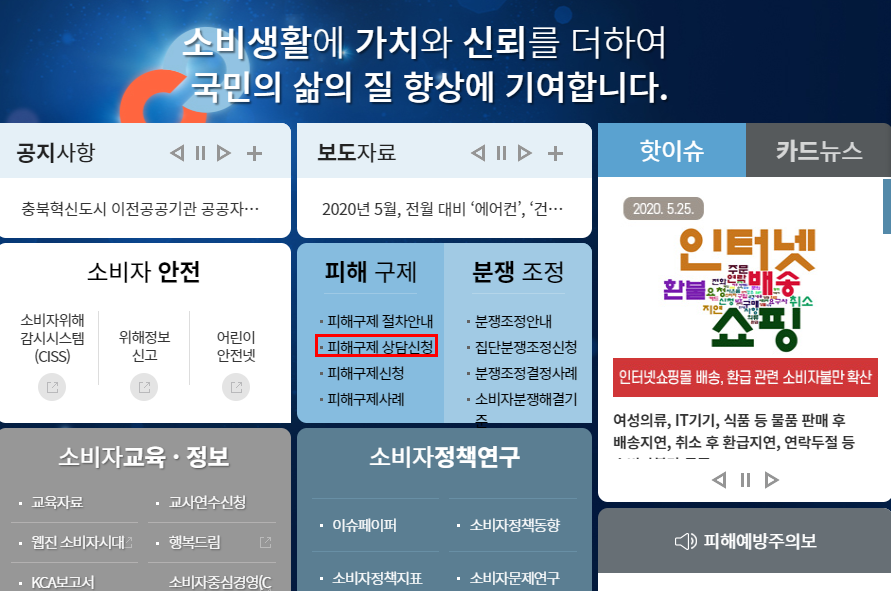 한국소비자원 홈페이지에 들어가게 되면, 여러가지 메뉴가 있습니다.
