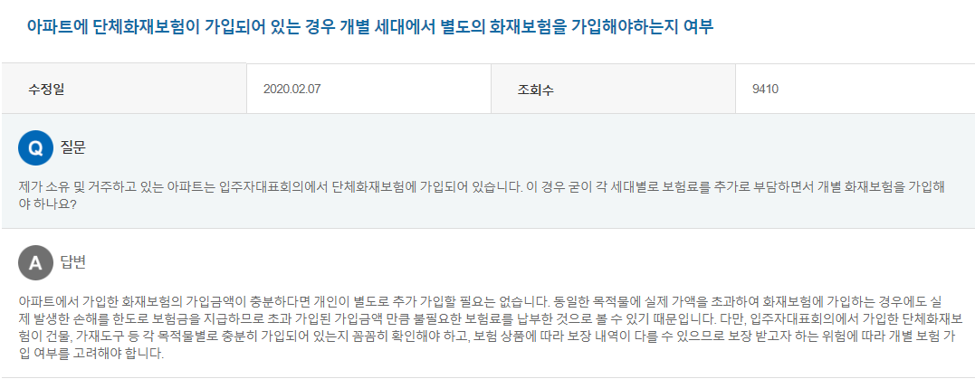 위 사례의 경우에는, 단체 화재보험에 가입이 되어 있는데 세대별로 별도의 화재보험을 가입을 해야 하는지에 대한 정보가 상당히 디테일하게 나와있습니다.