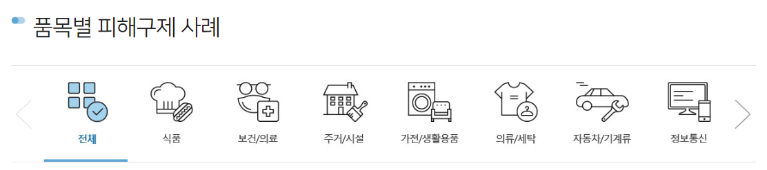 소비자보호원의 피해구제사례에 들어가게 되면, 품목별 피해구제 사례의 카테고리가 나뉘어져 있습니다.