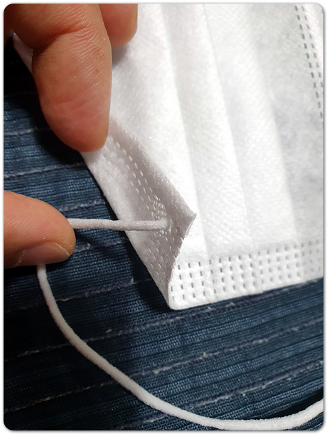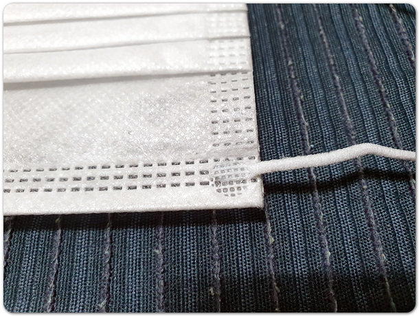 흰색의 덴탈마스크의 경우, 이렇게 앞뒤가 매우 헷갈리는 경우가 많은데 고무줄이 접합된 면을 체크해서 빠르게 마스크의 앞뒤를 확인할 수 있어 보다 쾌적한 출근준비를 보장해주는 방법입니다.