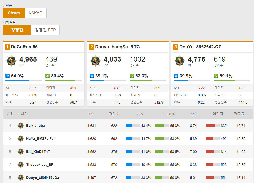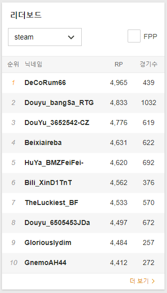리더보드 메뉴에 들어가시면, 스팀 및 다음 배틀 그라운드의 플랫폼을 설정 후 경쟁전, 경쟁전 FPP 모드를 설정해주면 탑 랭커들의 순위를 한눈에 확인할 수 있습니다.