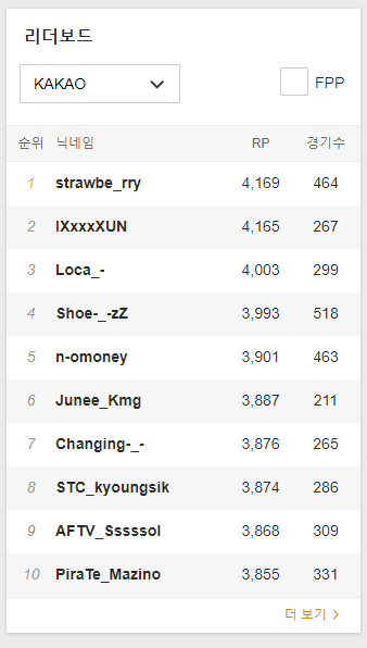고티어 랭커들의 RP, K/D, 데미지 등을 확인하실 수 있으며, 승률과 10위권 퍼센테이지를 볼 수 있습니다.