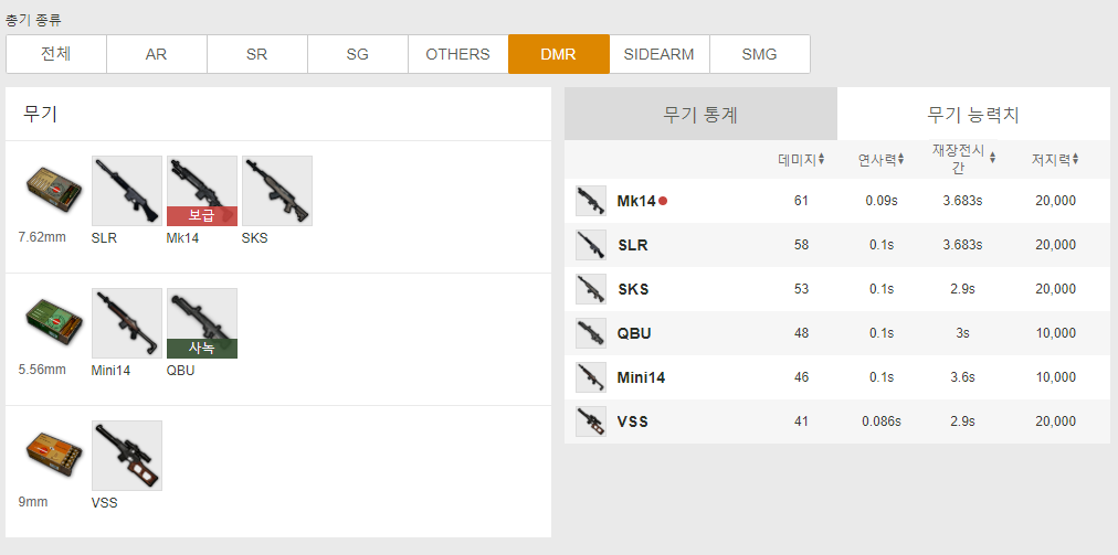 무기별 사녹, 보급 등 유형을 살펴볼 수 있으며 무기별 카테고리가 잘 분류되어 있어 한눈에 구경하기 편하게 되어있습니다.