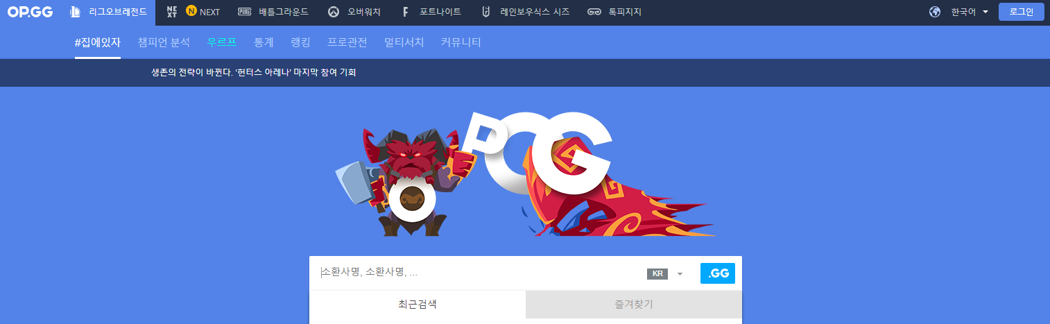 오피지지는, 리그오브레전드의 전적검색 사이트로 흔히 알고계시겠지만, 배틀 그라운드의 전전검색 서비스도 같이 하고 있습니다.