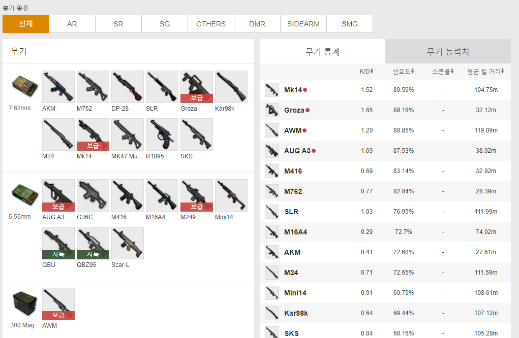 각 무기의 선호도, K/D 및 평균 킬 거리 등을 분석할 수 있는 무기분석 메뉴입니다.