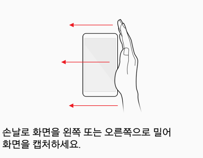 위의 그림처럼 손날을 이용해, 캡쳐하고 싶은 화면에서 손날로 스마트폰의 스크린을 밀어주면, 원하는 화면을 손쉽게 캡쳐할 수 있습니다.