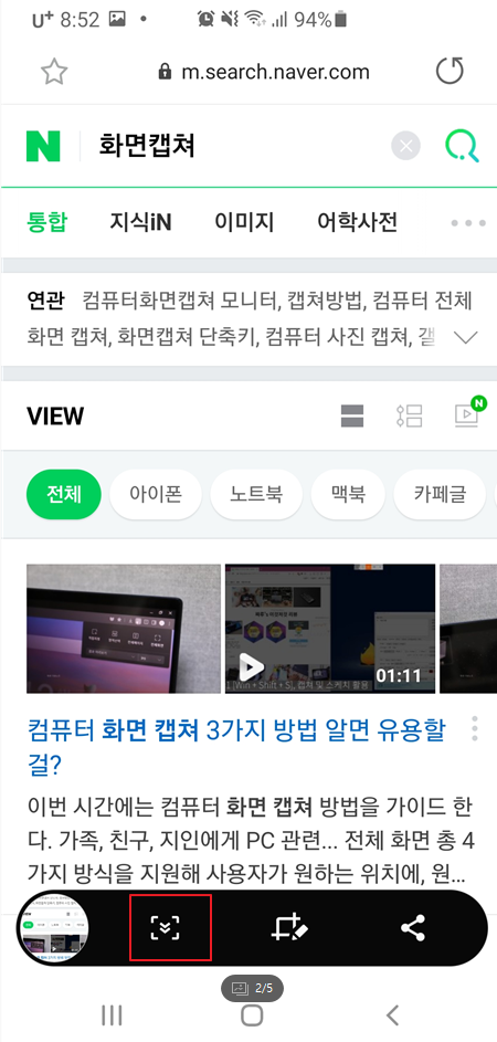 위 사진처럼 네이버 검색을 하다가 화면캡쳐를 하고 싶을때 다음과 같이 인터넷으로 정보를 검색하다가 볼륨다운, 전원버튼을 동시에 누르면 화면캡쳐 툴이 나타나게 됩니다.