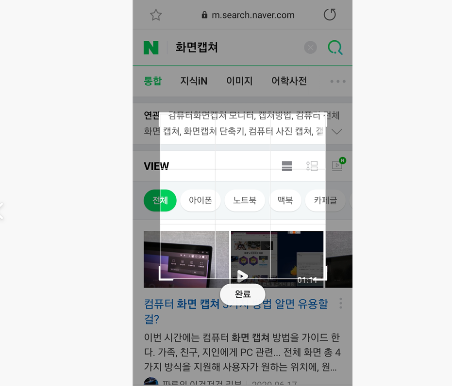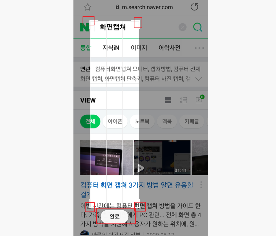 위와 같이, 네쪽 귀퉁이를 조절해주어 원하시는 영역을 선택 후, 완료 버튼을 눌러 캡처화면을 저장할 수 있습니다.
