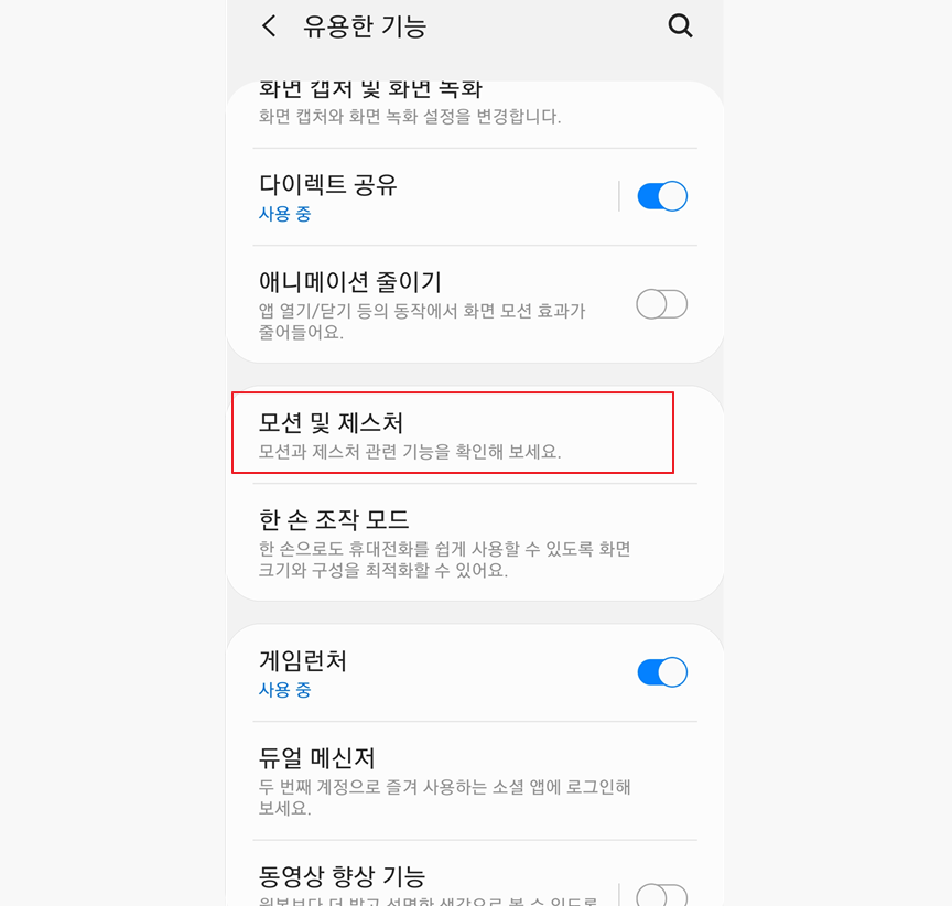 유용한 기능 메뉴를 보시면, 모션 및 제스처 기능설정 메뉴가 있습니다. 모션 및 제스처 기능설정 메뉴를 선택합니다.