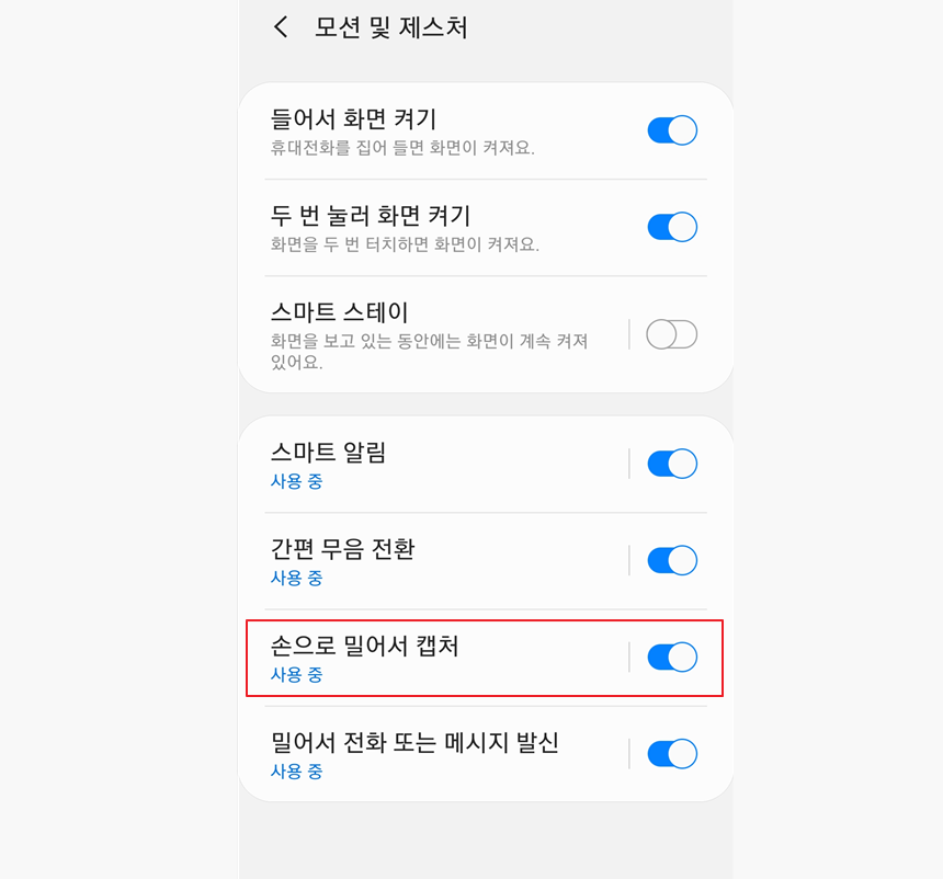 모션 및 제스처 기능설정항목에 '손으로 밀어서 캡처' 항목이 있습니다. 이 항목이 활성화가 되어있지 않다면, 오른쪽 단추를 눌러 활성화 시켜 준 후, 화려한 기교를 부리며 마음껏 손날로 원하는 화면을 캡쳐해주면 됩니다.