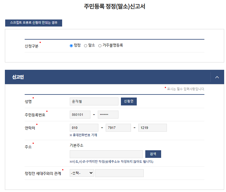 신고인에 세대분리할 사람의 성명, 주민등록번호, 연락처, 주소, 정정전 세대주와의 관계를 선택, 기입해줍니다.