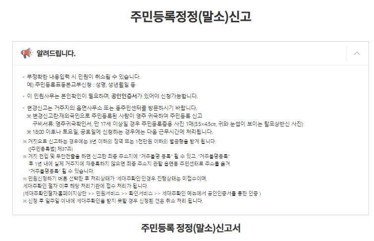 로그인을 완료 후, 주민등록정정 신고 신청 웹페이지에 들어왔습니다.
