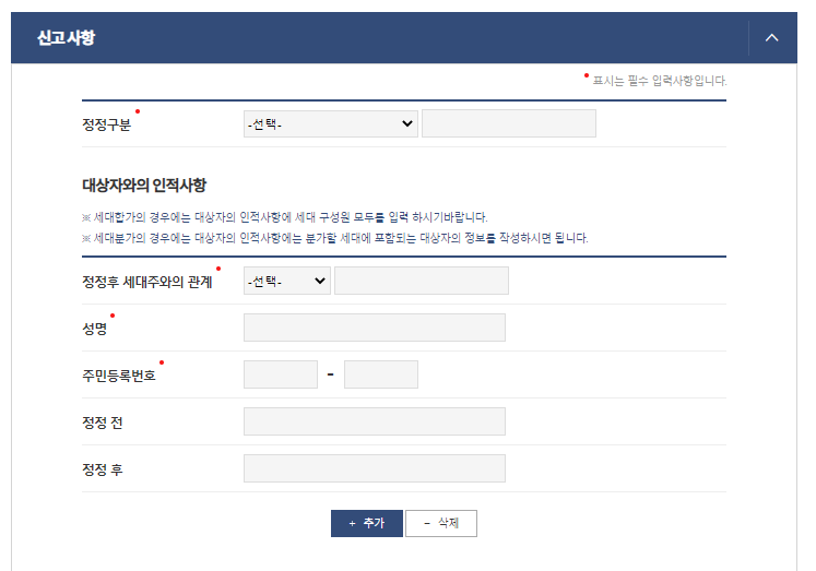 세대분가의 경우, 대상자의 인적사항에 분가할 세대에 포함되는 대상자의 정보를 작성하시면 됩니다.