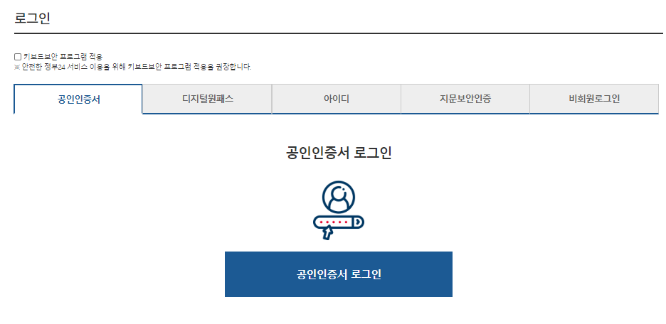 로그인이라고 해서 정부24 홈페이지에 회원가입을 꼭 해야하는것은 아니고, 공인인증서, 디지털원패스, 로그인(아이디), 지문보안인증 및 비회원 로그인을 통해서 본인인증절차를 거치고 민원 서비스를 이용하시면 됩니다.