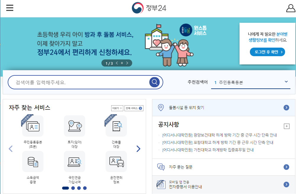 예전 민원24에서 보던 온라인 행정업무를 정부24를 통해서 볼 수 있습니다.