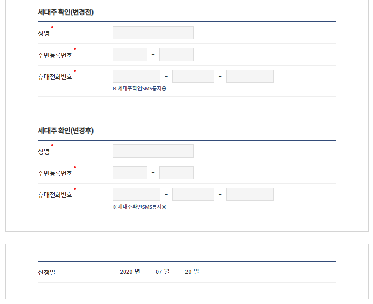 현재 세대주의 정보를 적어주면 해당 정보로 세대주 확인 sms통지 문자메세지가 발송됩니다.
