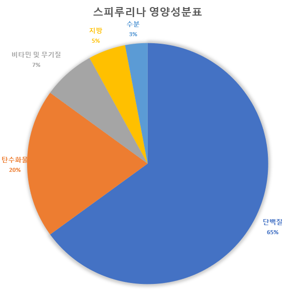 주목할만한점은, 클로렐라와 비슷하지만 단백질이 더 많이 함유되어있다는 점인데, 영양소 뿐만 아니라 클로렐라보다 소화흡수율이 아주 높아서 요즘에는 클로렐라 보다 그 효능과 효과 면에서 좀 더 각광받고 있는 분위기 입니다.