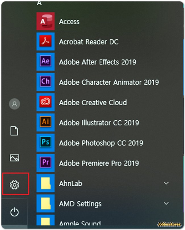 먼저 윈도우 아이콘을 클릭해서 설정 메뉴를 열겠습니다.