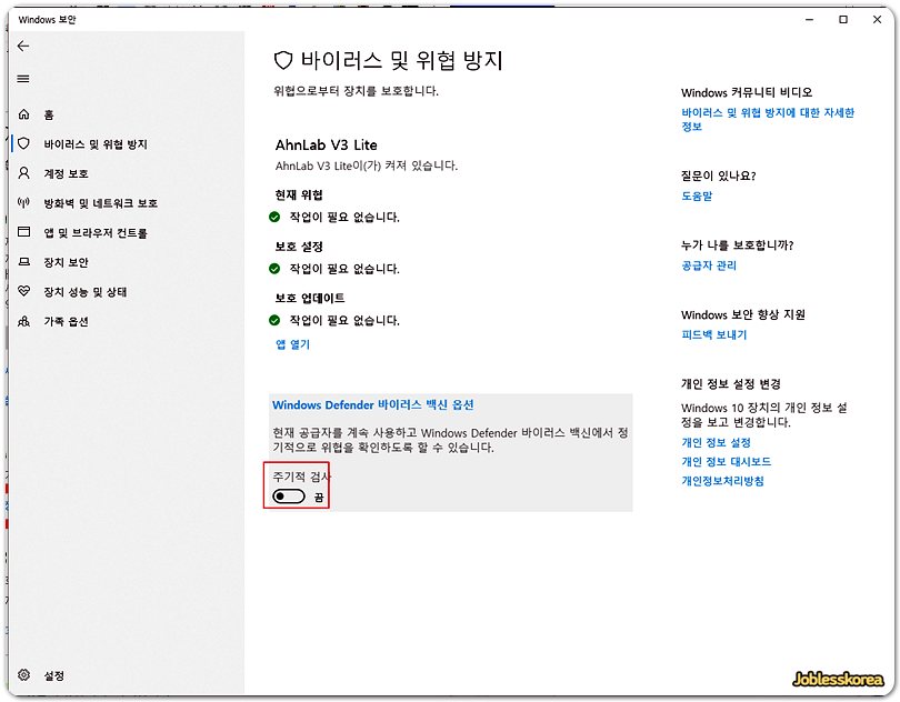 제가 따로 사용하는 백신 프로그램이 있어서, 윈도우 10에서 기본으로 제공해주는 디펜더는 설정을 해제해 백신 프로그램이 중복으로 구동되지 않고 시스템 리소스를 잡아먹지 않게 셋팅해주고 있습니다.