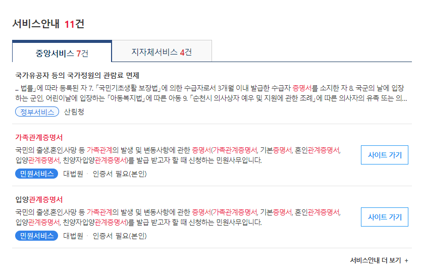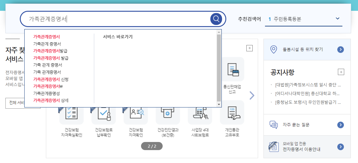 상단의 검색창에 '가족관계증명서' 를 검색합니다.