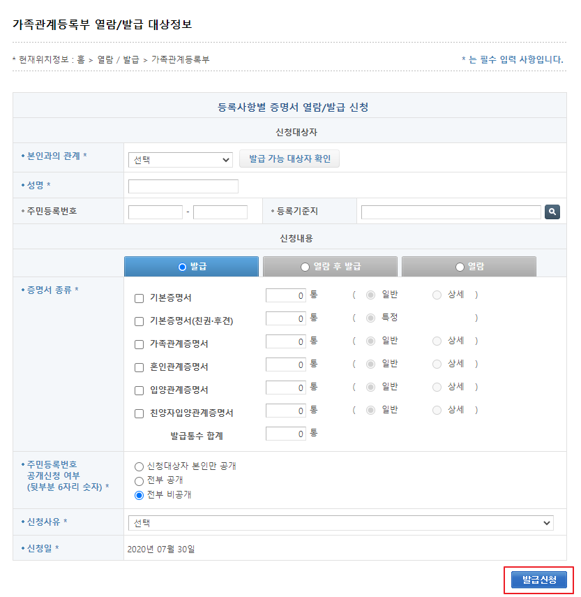 신청대상자의 개인정보등을 기입한 후 필요한 증명서에 체크, 인쇄할 수량을 넣어주고 발급신청 버튼을 누르시면 집에서도 쉽게 가족관계증명서를 발급받을 수 있겠습니다.