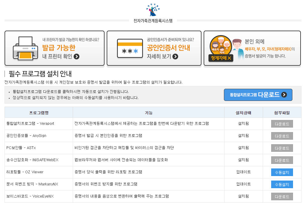 하지만, 각종 보안 프로그램들이 설치가 안되어있다면 가족관계증명서를 당장 발급받을 수 없습니다.