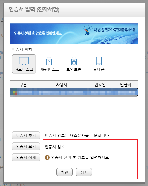 통합인증서를 다운로드 받은 후, 드디어 가족관계증명서를 발급받을 수 있는 페이지가 정상적으로 보이네요!