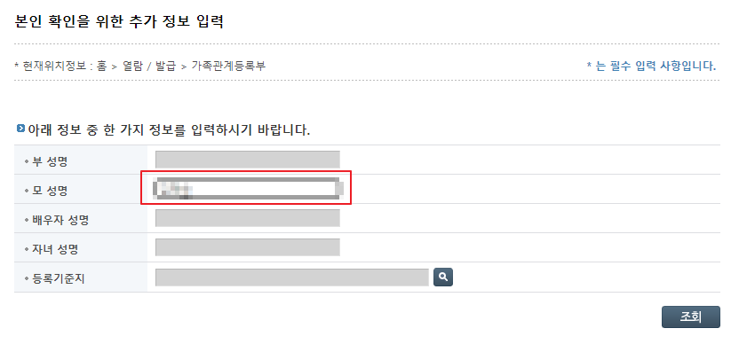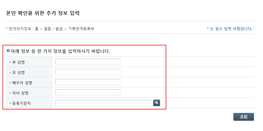 조회 버튼을 누르면 바로 가족관계증명서 출력이 가능한 페이지가 열립니다.