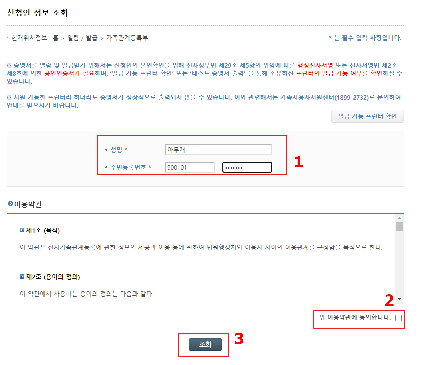 차례대로 개인정보를 입력해주고, 이용약관에 동의한 후, 조회 버튼을 눌러줍니다.