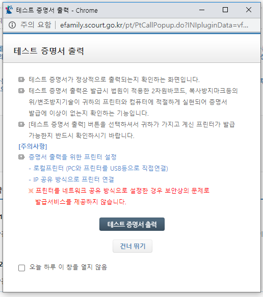 가족관계증명서를 클릭하면, 테스트 증명서 출력 팝업이 나오게 되는데, PC와 프린터가 잘 연결되어 있는지 테스트 인쇄를 진행할 수 있겠습니다.