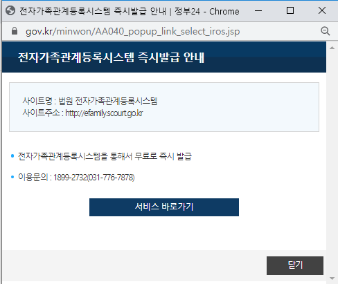 '가족관계증명서 사이트가기' 를 클릭하셨다면, 위와같이 팝업이 하나 뜰텐데, '서비스 바로가기' 를 클릭해서 가족관계증명서 발급 페이지로 이동하겠습니다.