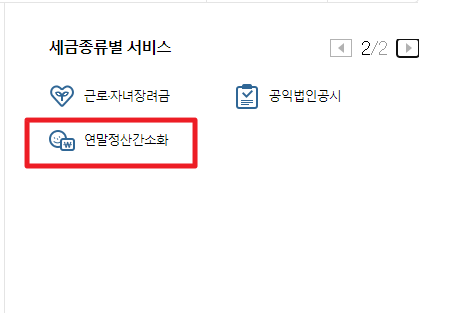 공인인증서 로그인을 완료하시고, 우측 하단의 세금종류별 서비스에 연말정산 간소화 서비스 메뉴가 숨어있습니다.